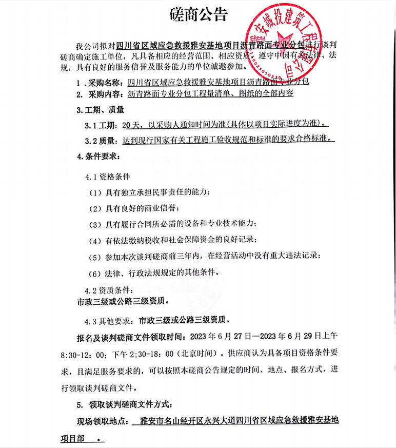 四川省區(qū)域應(yīng)急救援雅安基地項目瀝青路面專業(yè)分包談判磋商公告