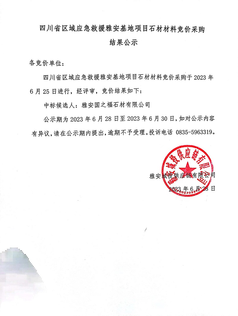 四川省區(qū)域應急救援雅安基地項目石材材料競價采購結果公示