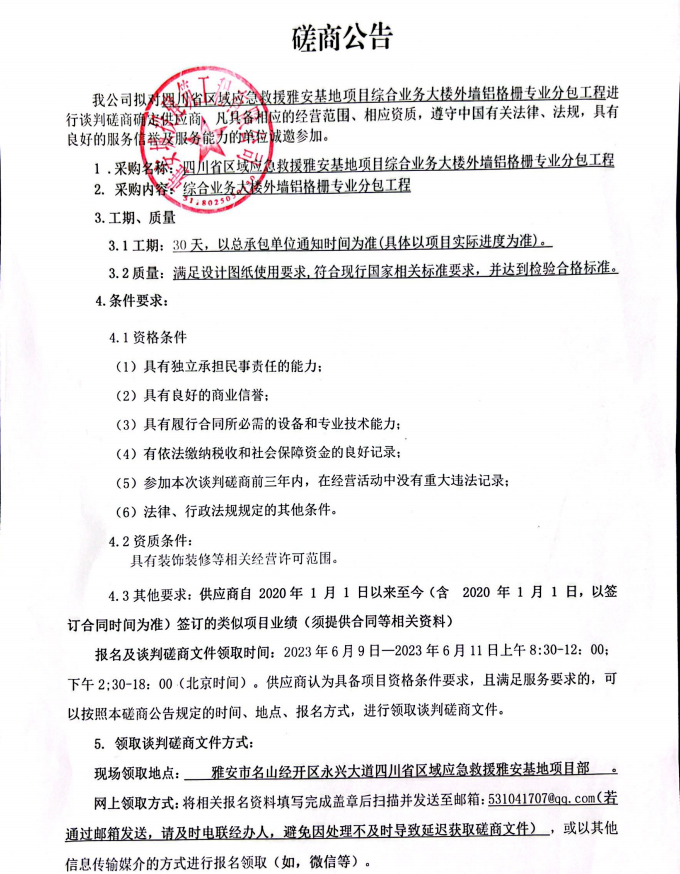 四川省區(qū)域應(yīng)急救援雅安基地項(xiàng)目綜合業(yè)務(wù)大樓外墻鋁格柵專業(yè)分包工程談判磋商公告