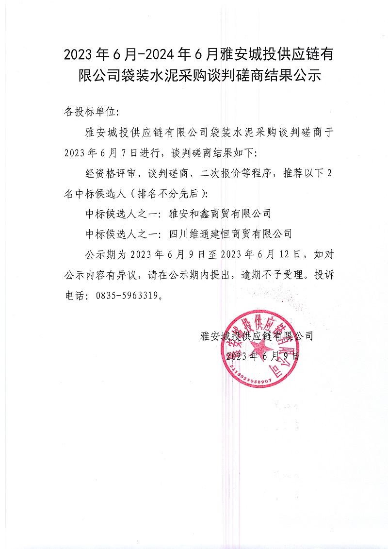 2023年6月-2024年6月雅安城投供應(yīng)鏈有限公司袋裝水泥采購談判磋商結(jié)果公示
