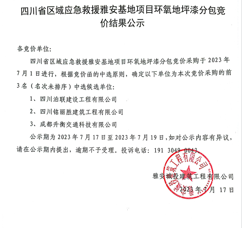 四川省區(qū)域應(yīng)急救援雅安基地項(xiàng)目環(huán)氧地坪漆分包競(jìng)價(jià)結(jié)果公示