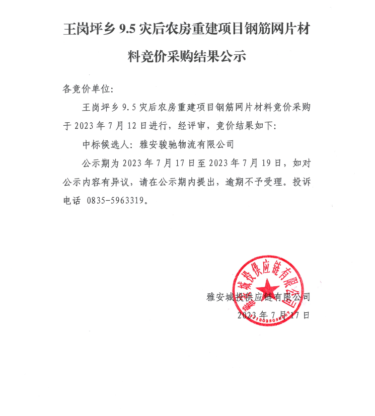王崗坪鄉(xiāng)9.5災(zāi)后農(nóng)房重建項目鋼筋網(wǎng)片材料競價采購結(jié)果公示