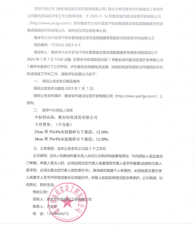 雅安市大興片區(qū)地下綜合管廊建設(shè)項(xiàng)目道路攤鋪勞務(wù)服務(wù)采購項(xiàng)目評(píng)標(biāo)結(jié)果公示