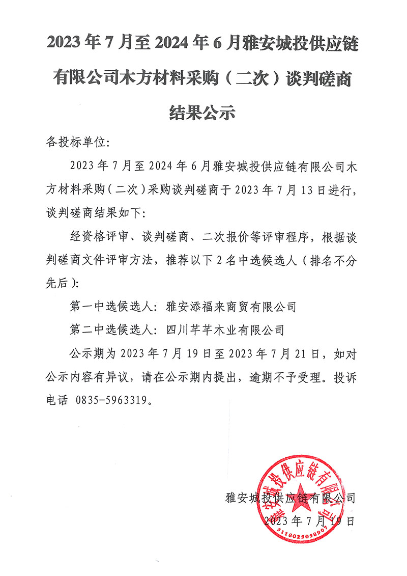 2023年7月至2024年6月雅安城投供應(yīng)鏈有限公司木方材料采購(gòu)(二次)談判磋商結(jié)果公示
