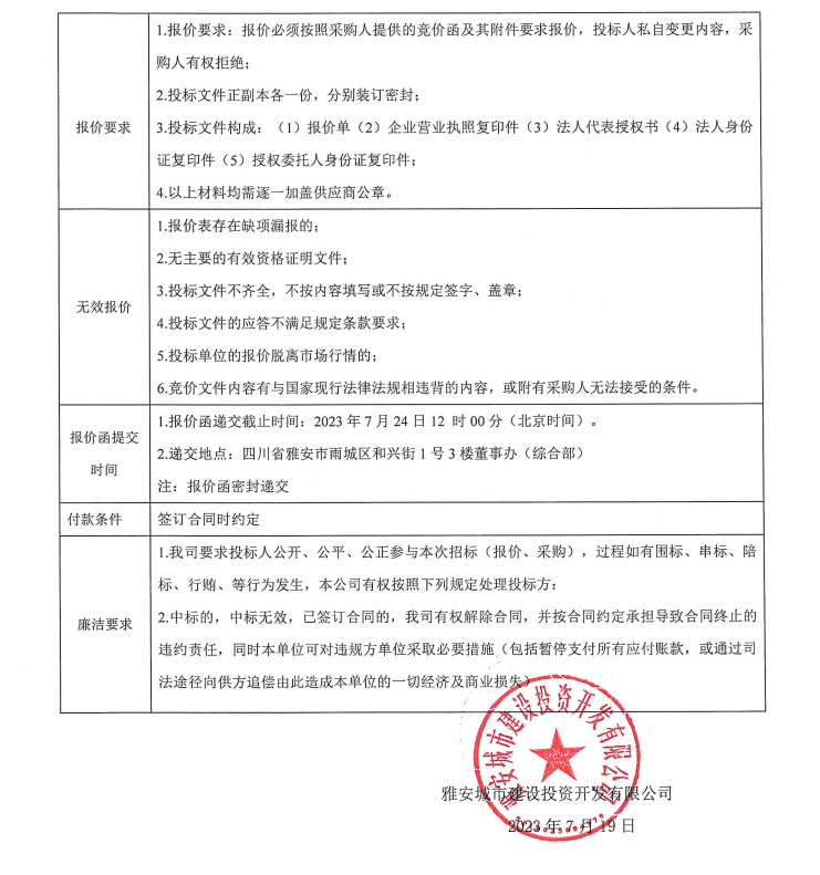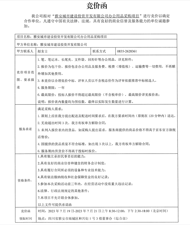 雅安城市建設(shè)投資開發(fā)有限公司辦公用品采購項(xiàng)目競(jìng)價(jià)公告
