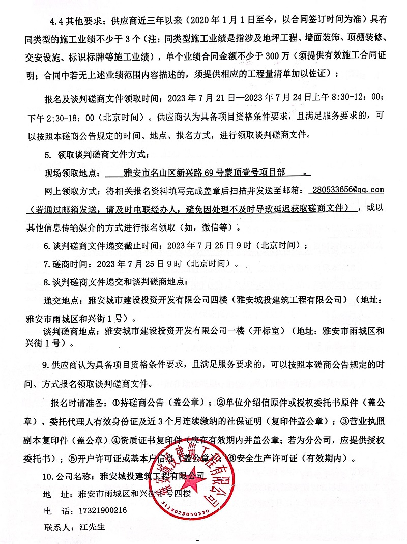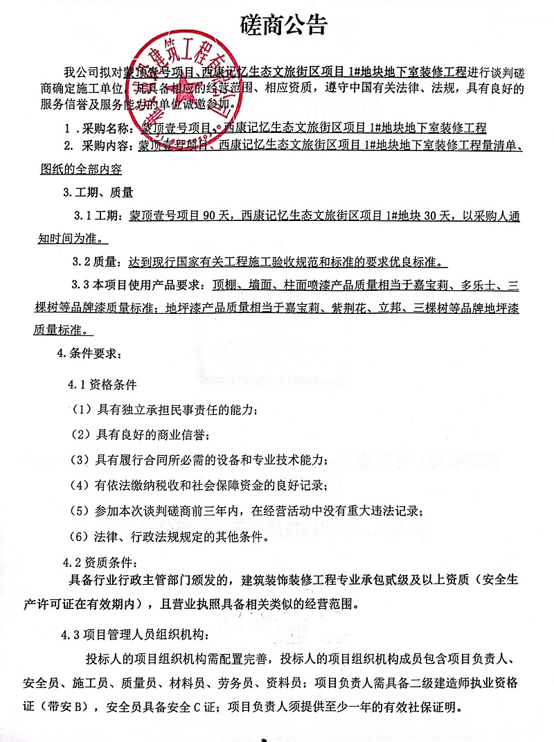 蒙頂壹號項(xiàng)目、西康記憶生態(tài)文旅街區(qū)項(xiàng)目1#地塊地下室裝修工程談判磋商公告