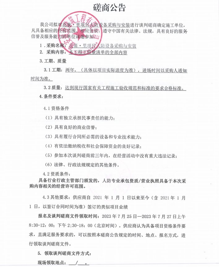 漢源縣花襄·里項目人防設(shè)備采購與安裝談判磋商公告