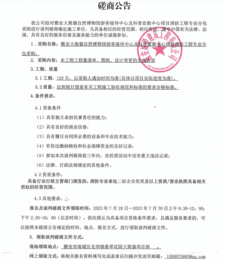 雅安大熊貓自然博物館游客接待中心及科普宣教中心項目消防工程專業(yè)分包采購談判磋商公告