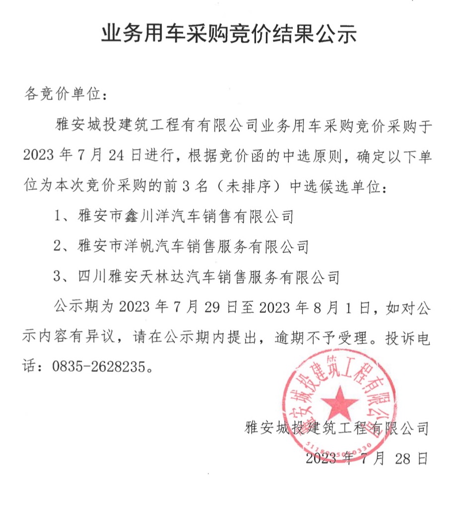 業(yè)務(wù)用車采購競價(jià)結(jié)果公示