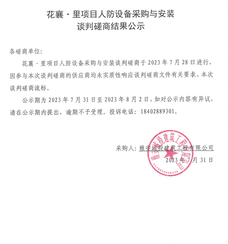 花襄·里項目人防設(shè)備采購與安裝談判磋商結(jié)果公示