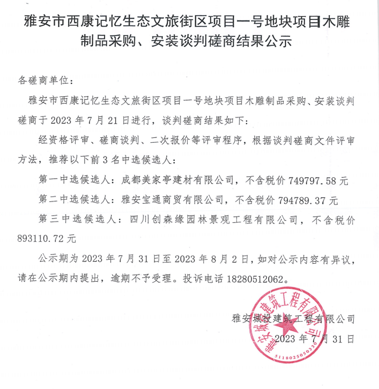 雅安市西康記憶生態(tài)文旅街區(qū)項(xiàng)目一號(hào)地塊項(xiàng)目木雕制品采購、安裝談判磋商結(jié)果公示
