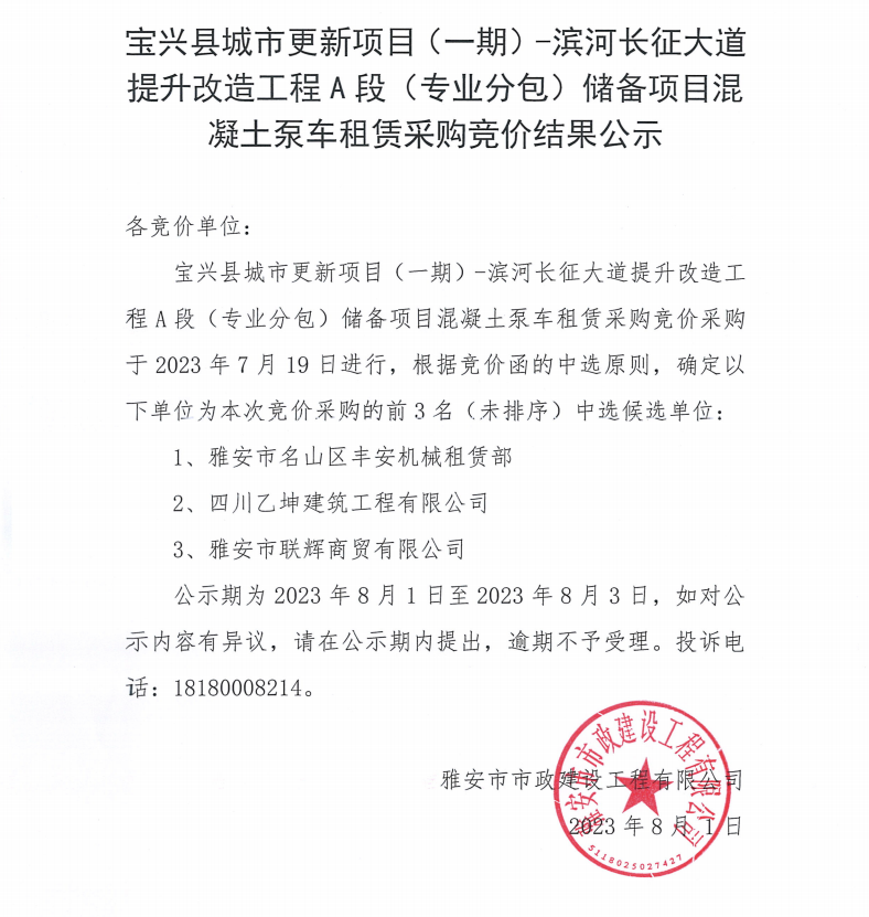 寶興縣城市更新項目(一期)-濱河長征大道提升改造工程A段(專業(yè)分包)儲備項目混凝土泵車租賃采購競價結(jié)果公示