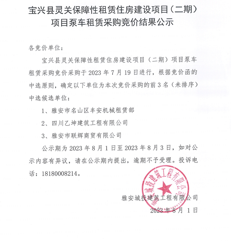 寶興縣靈關(guān)保障性租賃住房建設(shè)項(xiàng)目(二期)項(xiàng)目泵車(chē)租賃采購(gòu)競(jìng)價(jià)結(jié)果公示