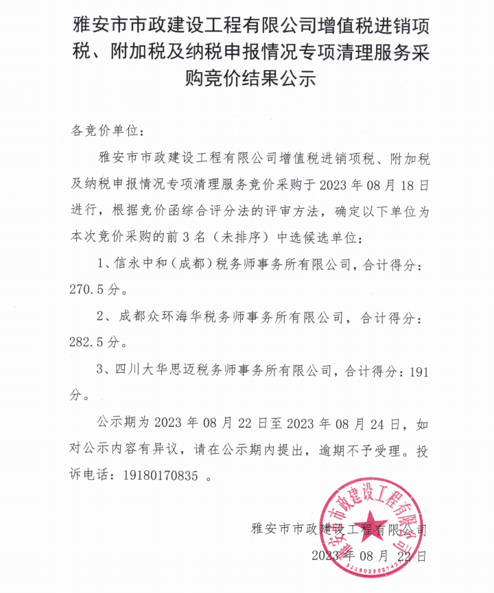雅安市市政建設(shè)工程有限公司增值稅進(jìn)銷(xiāo)項(xiàng)稅、附加稅及納稅申報(bào)情況專(zhuān)項(xiàng)清理服務(wù)采購(gòu)競(jìng)價(jià)結(jié)果公示