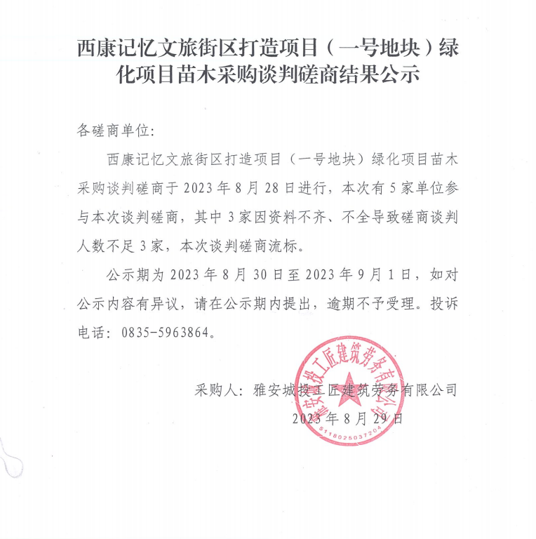 西康記憶文旅街區(qū)打造項目(一號地塊)綠化項目苗木采購談判磋商結果公示