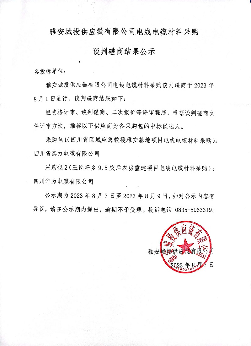 雅安城投供應(yīng)鏈有限公司電線電纜材料采購(gòu)談判磋商結(jié)果公示