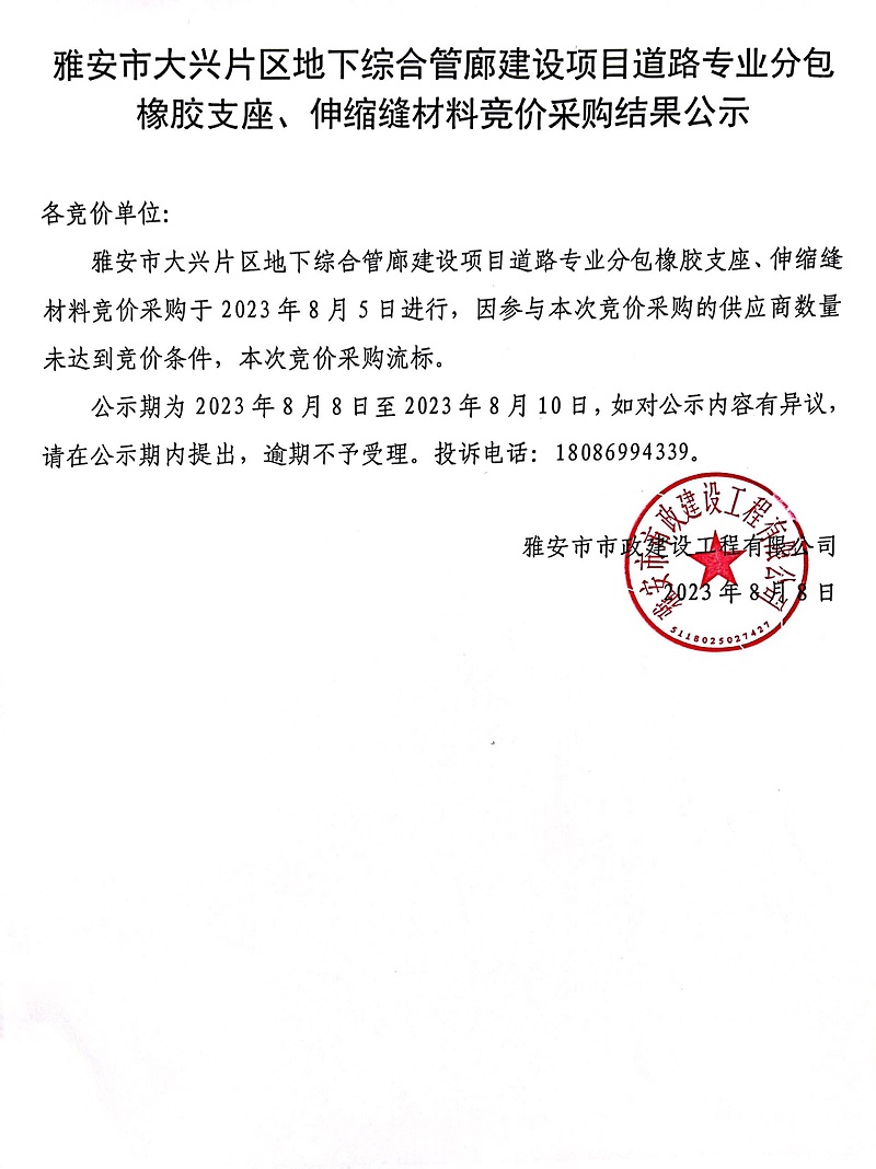 雅安市大興片區(qū)地下綜合管廊建設(shè)項目道路專業(yè)分包橡膠支座、伸縮縫材料競價采購結(jié)果公示