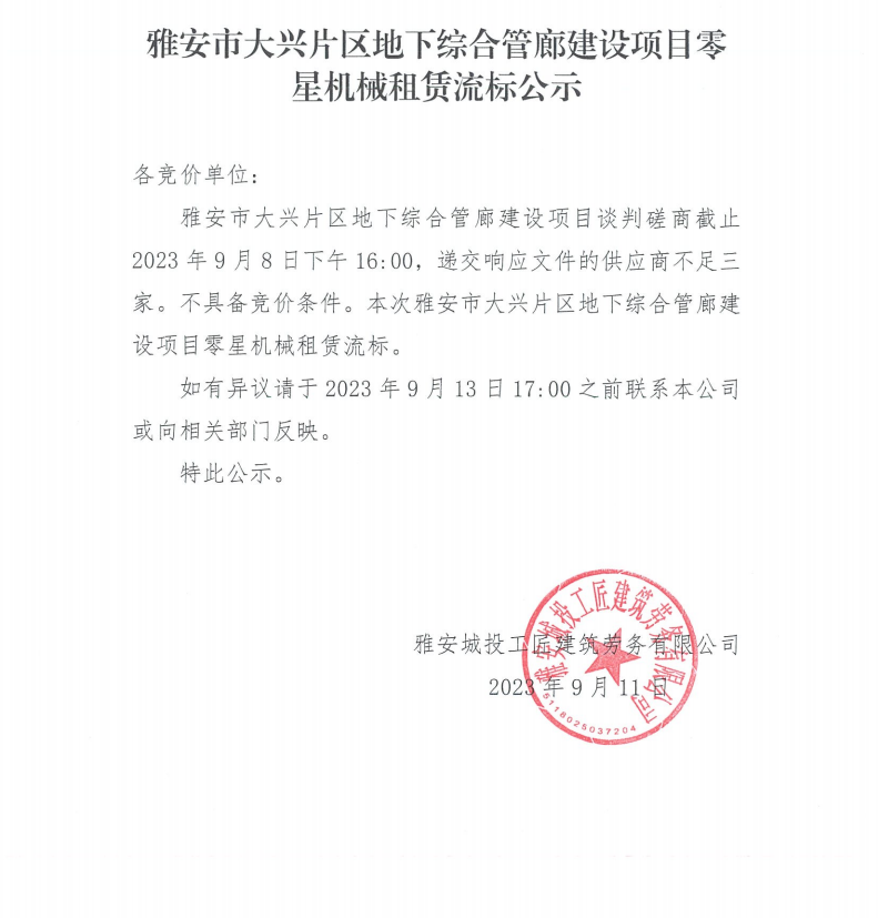 雅安市大興片區(qū)地下綜合管廊建設(shè)項目零星機械租賃流標公示