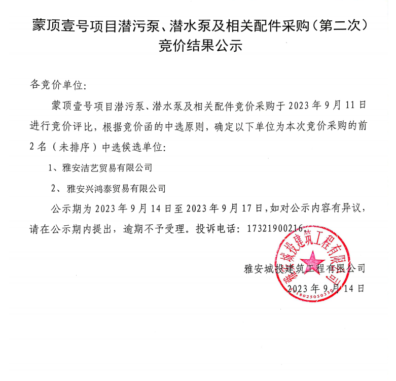 蒙頂壹號項目潛污泵、潛水泵及相關(guān)配件采購(第二次)競價結(jié)果公示
