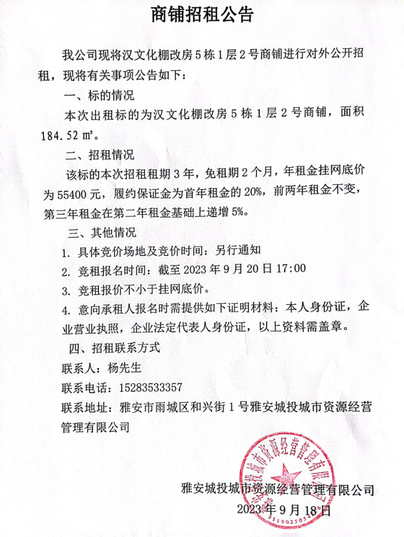 漢文化棚改房5棟1層2號商鋪招租公告