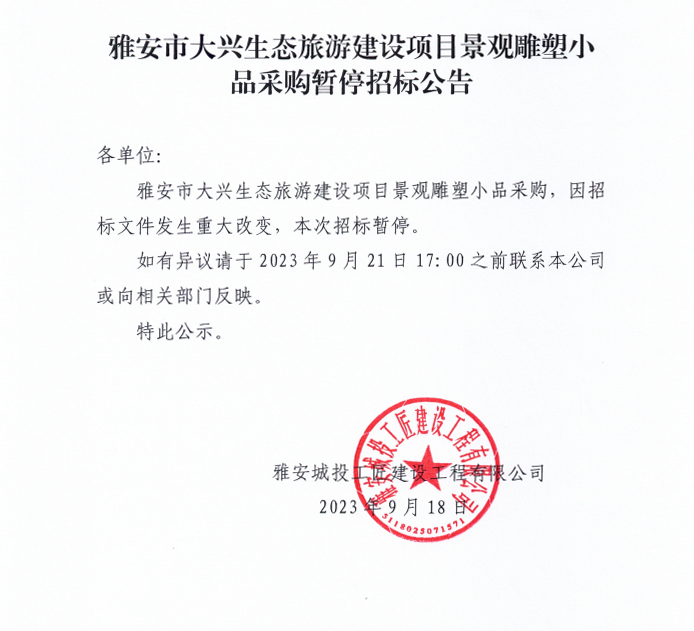 雅安市大興生態(tài)旅游建設項目景觀雕塑小品采購暫停招標公告