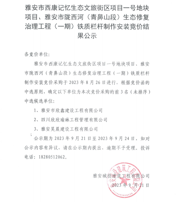 雅安市西康記憶生態(tài)文旅街區(qū)項(xiàng)目一號(hào)地塊項(xiàng)目、雅安市隴西河(青鼻山段)生態(tài)修復(fù)治理工程(一期)鐵質(zhì)欄桿制作安裝競(jìng)價(jià)結(jié)果公示