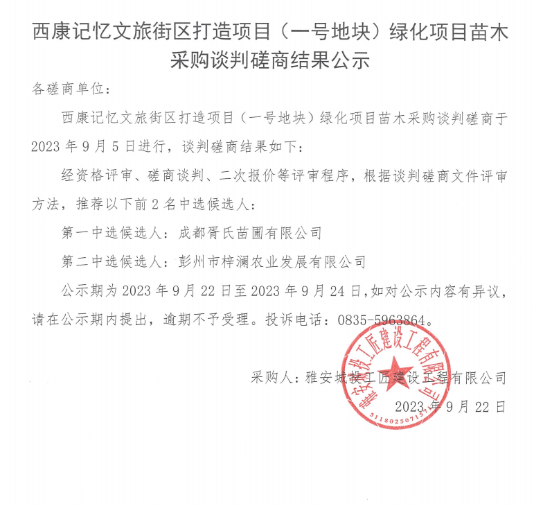 西康記憶文旅街區(qū)打造項(xiàng)目(一號(hào)地塊)綠化項(xiàng)目苗木采購(gòu)談判磋商結(jié)果公示