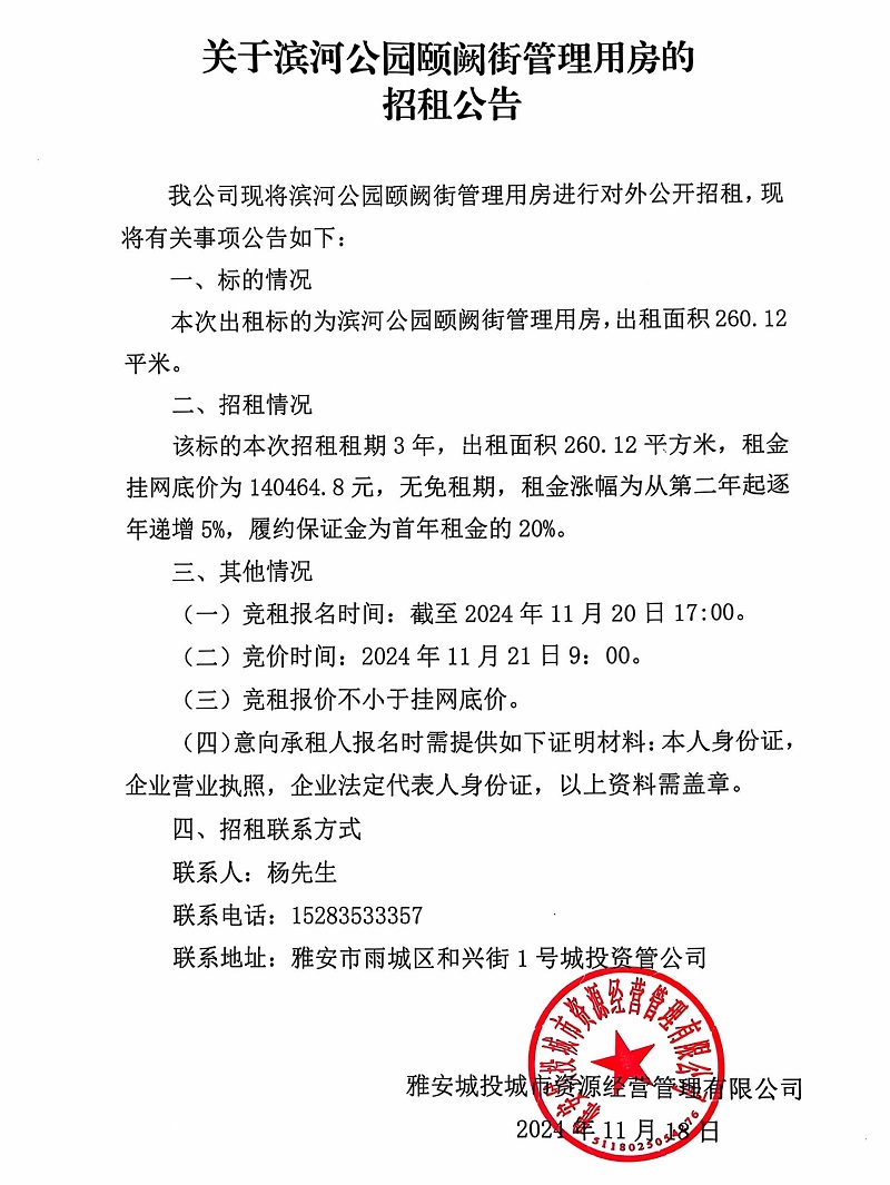 關(guān)于濱河公園頤闕街管理用房的招租公告