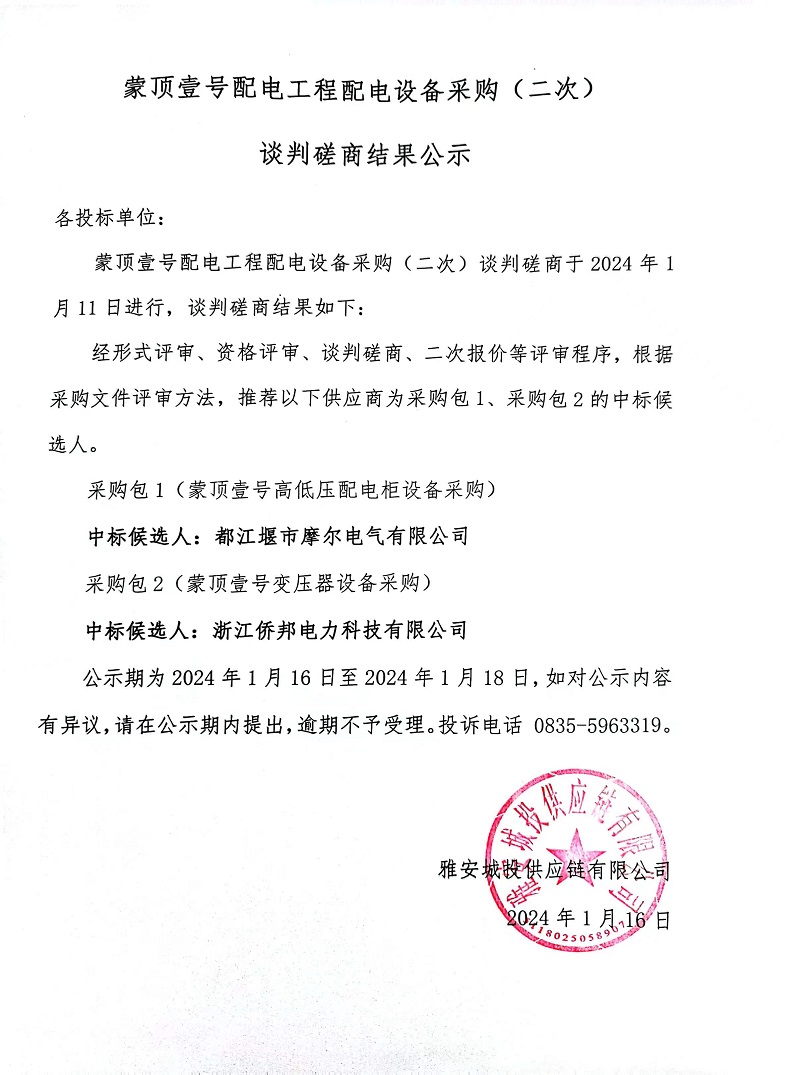 蒙頂壹號配電工程配電設備采購(二次)談判磋商結果公示