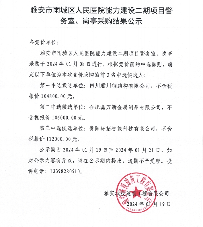 雅安市雨城區(qū)人民醫(yī)院能力建設(shè)二期項(xiàng)目警務(wù)室、崗?fù)げ少?gòu)結(jié)果公示