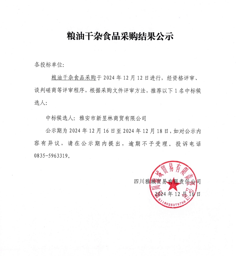 糧油干雜食品采購(gòu)結(jié)果公示