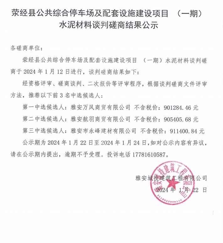 滎經縣公共綜合停車場及配套基礎設施建設項目(一期)水泥材料談判磋商結果公示