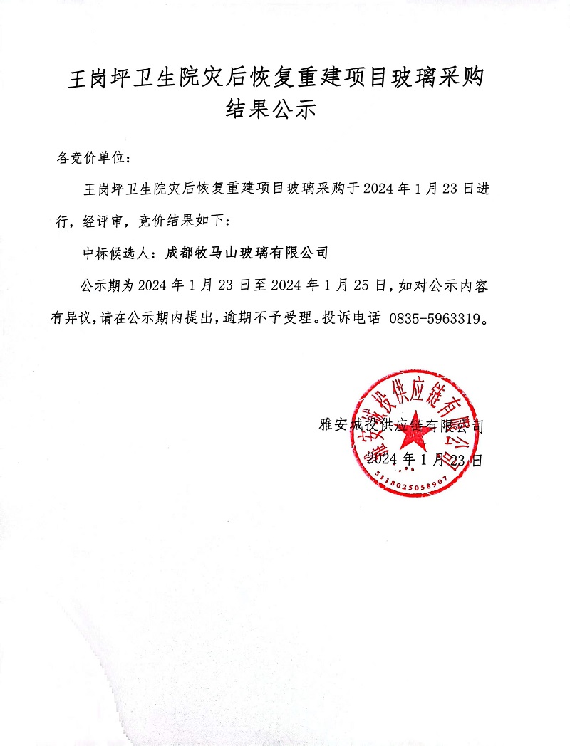 王崗坪衛(wèi)生院災(zāi)后恢復(fù)重建項(xiàng)目玻璃采購結(jié)果公示