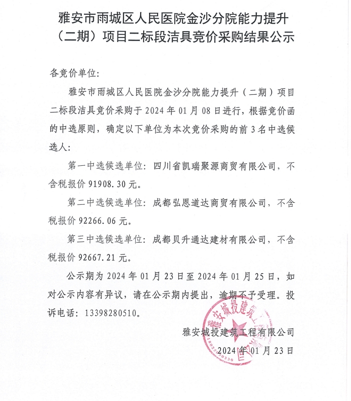 雅安市雨城區(qū)人民醫(yī)院金沙分院能力提升(二期)項目二標段潔具競價采購結果公示