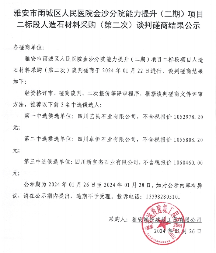雅安市雨城區(qū)人民醫(yī)院金沙分院能力提升(二期)項(xiàng)目二標(biāo)段人造石材料采購(第二次)談判磋商結(jié)果公示