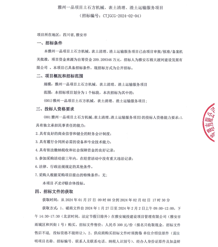 雅州一品項目土石方機械、表土清理、渣土運輸服務(wù)項目公告