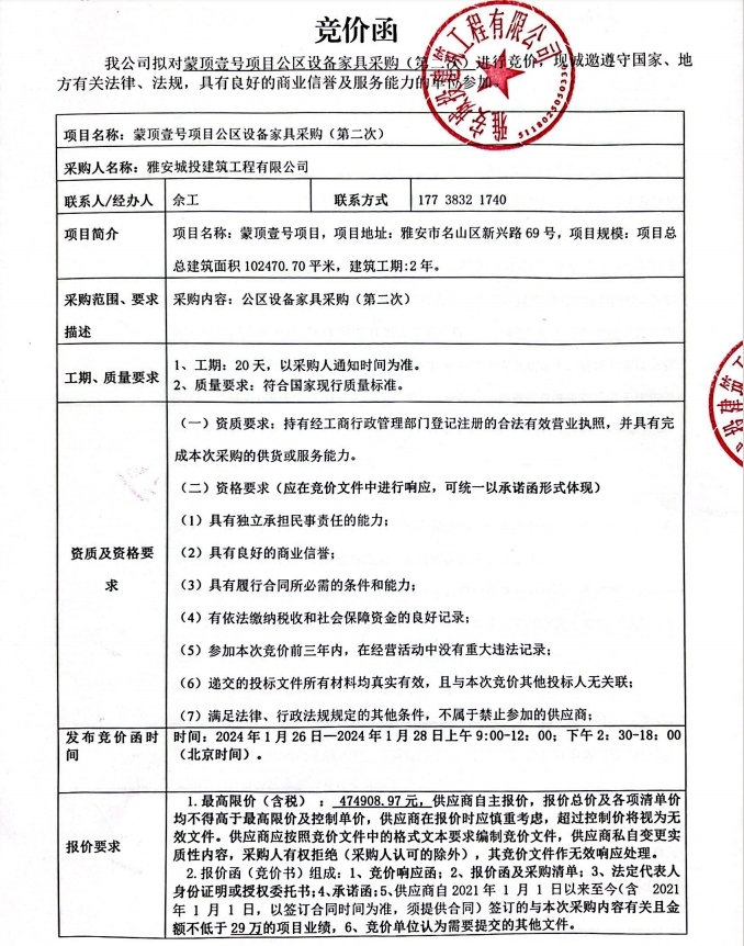 蒙頂壹號項目公區(qū)設備家具采購(第二次)競價公告