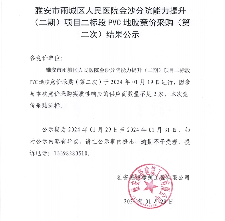 雅安市雨城區(qū)人民醫(yī)院金沙分院能力提升(二期)項(xiàng)目二標(biāo)段PVC地膠競(jìng)價(jià)采購(gòu)(第二次)結(jié)果公示