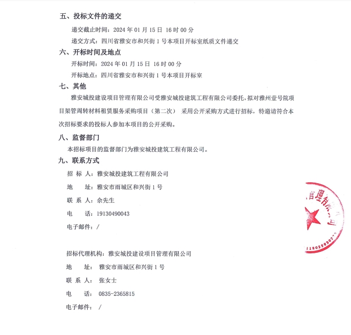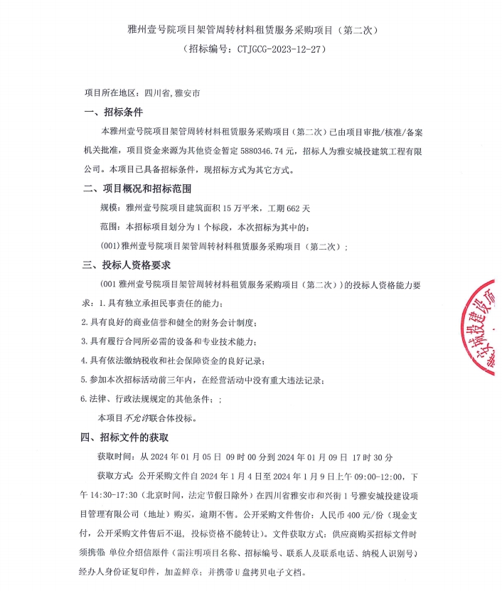 雅州壹號(hào)院項(xiàng)目架管周轉(zhuǎn)材料租賃服務(wù)采購項(xiàng)目(第二次)公告
