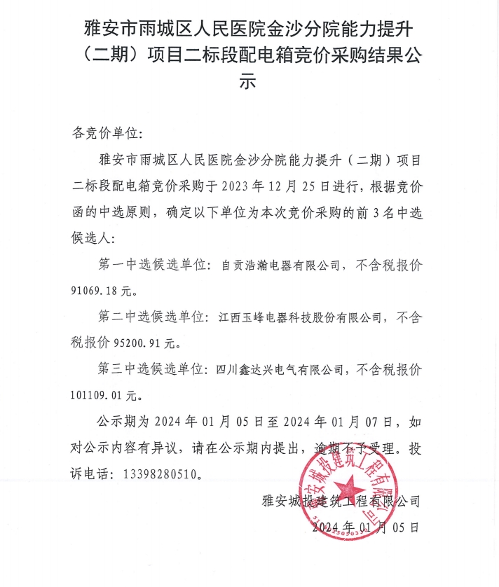 雅安市雨城區(qū)人民醫(yī)院金沙分院能力提升(二期)項目二標段配電箱競價采購結果公示