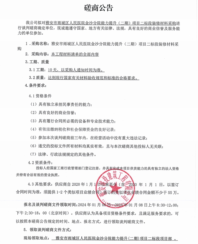 雅安市雨城區(qū)人民醫(yī)院金沙分院能力提升(二期)項目二標(biāo)段裝修材料采購談判磋商公告
