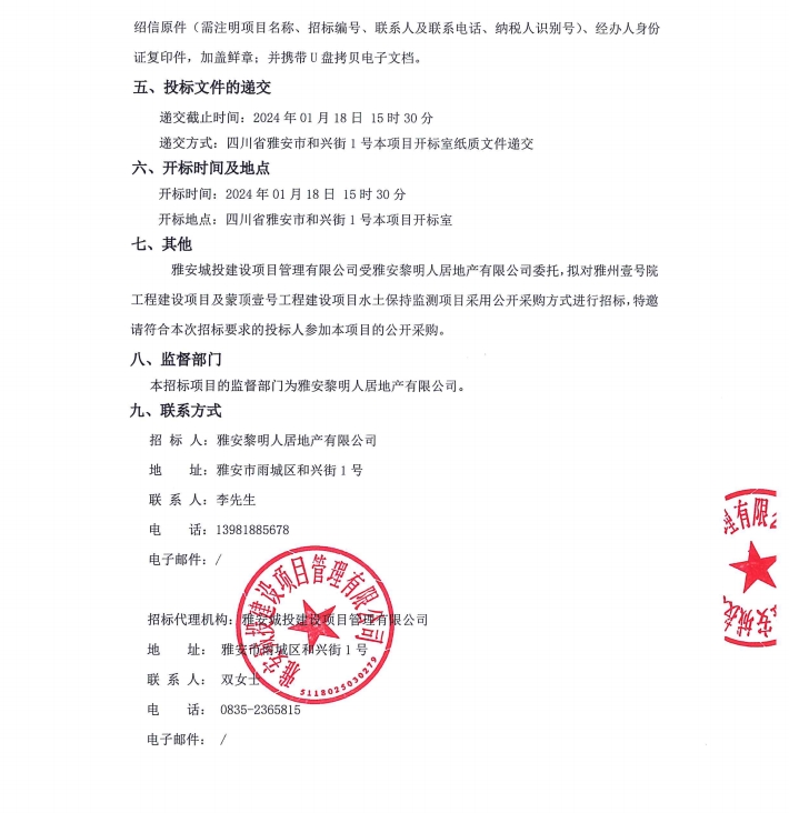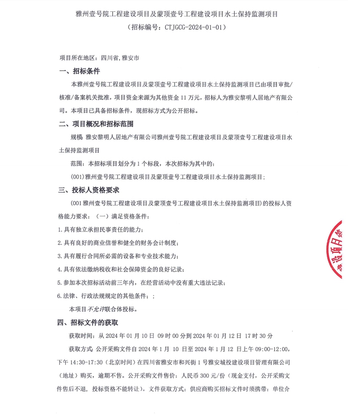 雅州壹號(hào)院工程建設(shè)項(xiàng)目及蒙頂壹號(hào)工程建設(shè)項(xiàng)目水土保持監(jiān)測(cè)項(xiàng)目公告