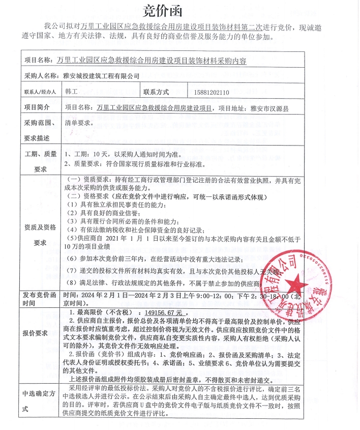 萬里工業(yè)園區(qū)應急救援綜合用房建設項目裝飾材料采購(第二次)競價公告