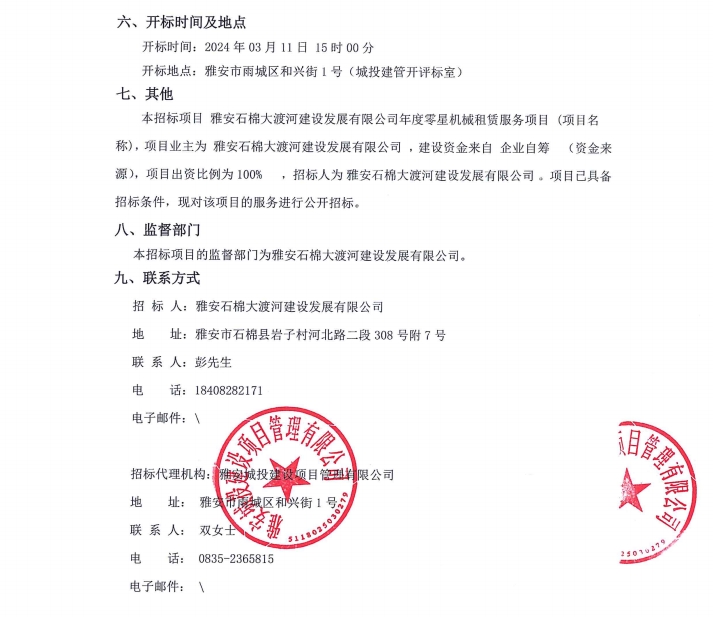 雅安石棉大渡河建設(shè)發(fā)展有限公司年度零星機(jī)械租賃服務(wù)項(xiàng)目公告
