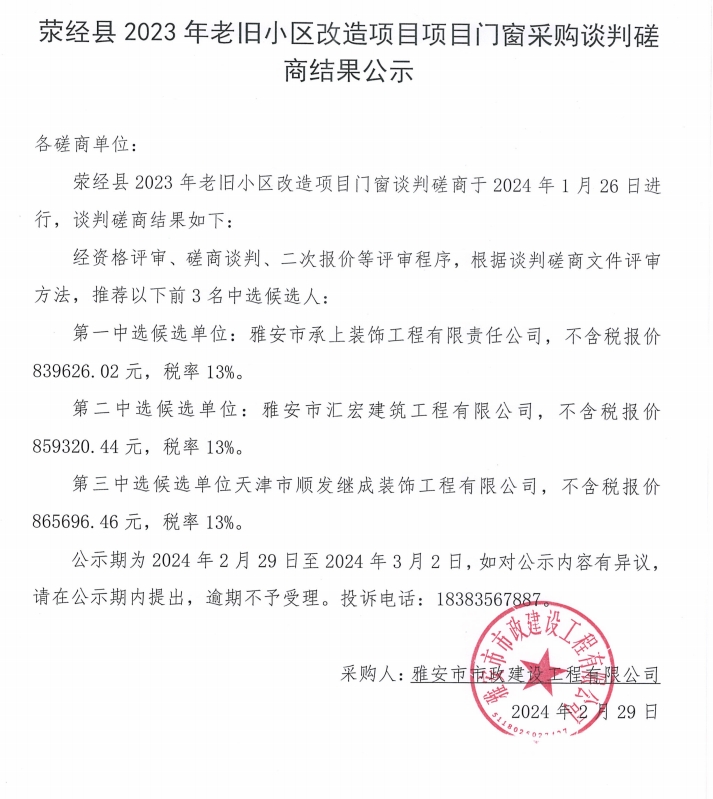 滎經(jīng)縣2023年老舊小區(qū)改造項(xiàng)目門窗采購采購談判磋商結(jié)果公示