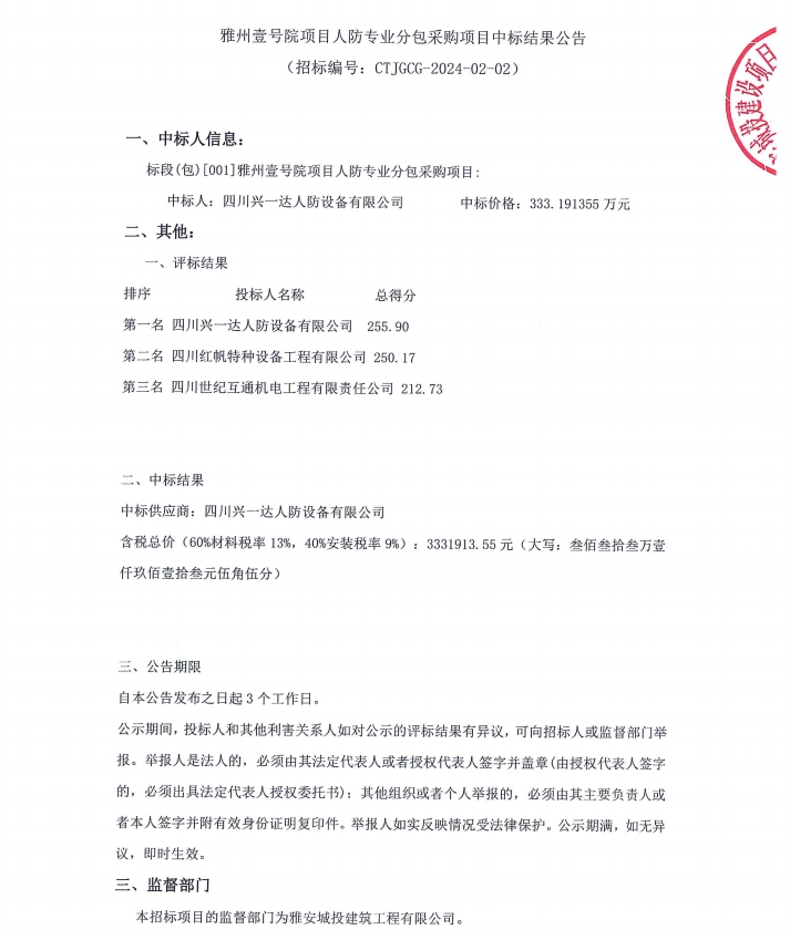 雅州壹號(hào)院項(xiàng)目人防專業(yè)分包采購(gòu)項(xiàng)目中標(biāo)結(jié)果公告