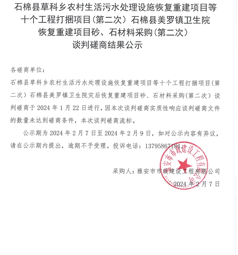 石棉縣草科鄉(xiāng)農(nóng)村生活污水處理設(shè)施恢復重建項目等十個工程打捆項目(第二次)石棉縣美羅鎮(zhèn)衛(wèi)生院恢復重建項目砂、石材料采購(第二次)談判磋商結(jié)果公示