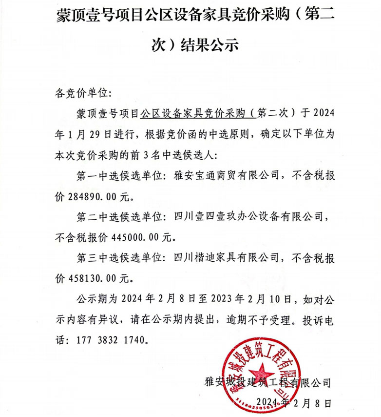 蒙頂壹號項目公區(qū)設(shè)備家具競價采購(第二次)結(jié)果公示
