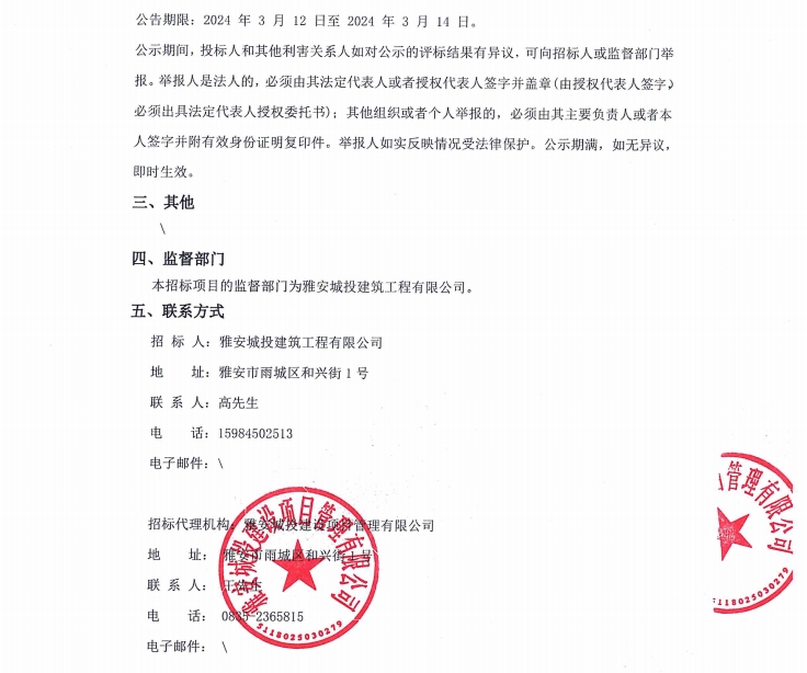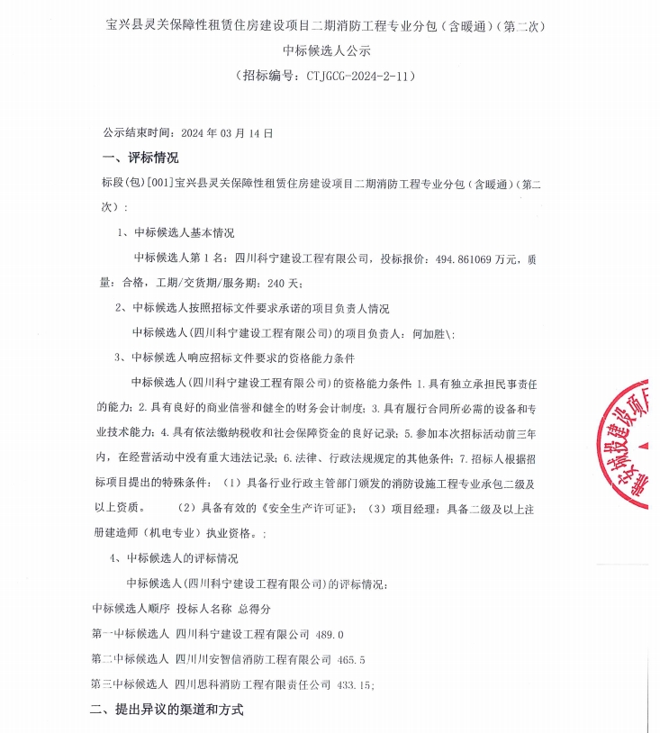 寶興縣靈關(guān)保障性租賃住房建設(shè)項目二期消防工程專業(yè)分包(含暖通)(第二次)中標候選人公示