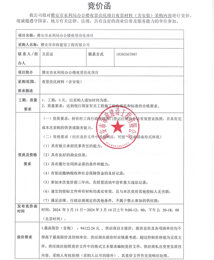 雅安市水利局辦公樓夜景亮化項(xiàng)目夜景材料(含安裝)采購(gòu)內(nèi)容競(jìng)價(jià)公告